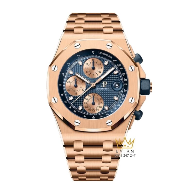 Trong đó, Royal Oak Offshore là dòng đồng hồ thể thao mạnh mẽ bậc nhất của Audemars Piguet, ra đời nhằm mở rộng tinh thần Royal Oak huyền thoại theo hướng táo bạo và hiện đại hơn. Phiên bản Royal Oak Offshore Chronograph 26238OR.OO.2000OR.01 thể hiện trọn vẹn DNA đó với bộ vỏ vàng hồng 18ct nguyên khối, kích thước 42mm cùng mặt số xanh đặc trưng, tạo nên diện mạo vừa sang trọng vừa đậm chất thể thao cao cấp.