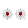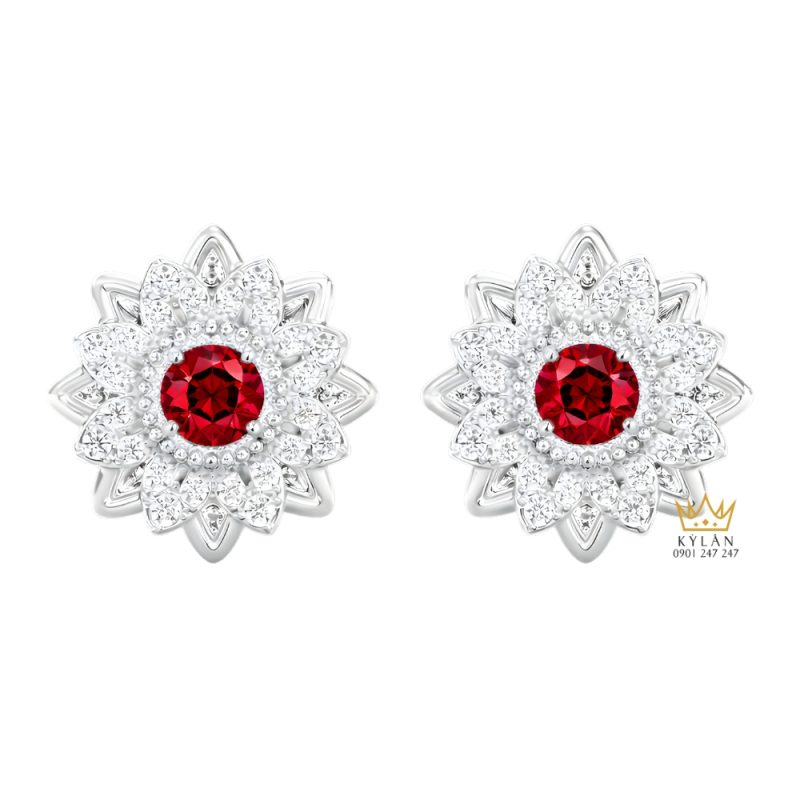 Tâm điểm của mỗi bên bông tai là viên đá quý đỏ dáng tròn được đặt ở vị trí trung tâm. Viên đá có sắc đỏ rực rỡ, chiều sâu rõ nét, tạo cảm giác nổi bật khi nhìn trực diện. Cách bố trí đá trung tâm giúp mặt bông tai giữ được sự ổn định về hình khối, đồng thời làm rõ màu sắc của viên đá mà không bị phân tán bởi các chi tiết khác.