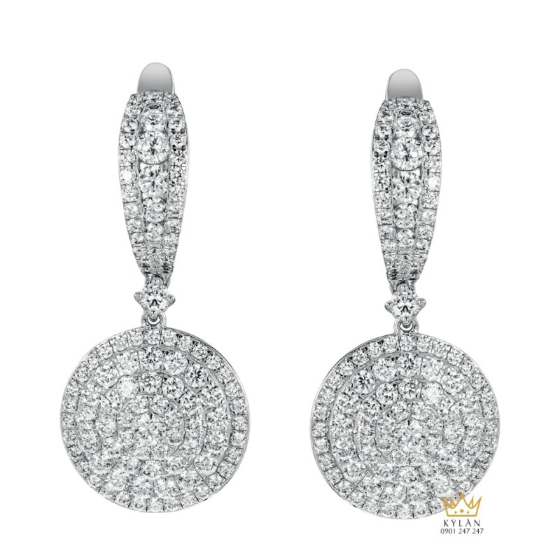 Bông tai vàng trắng Au750 thiết kế khoen dài đính kim cương, mặt tròn treo phía dưới phủ nhiều vòng kim cương đồng tâm.