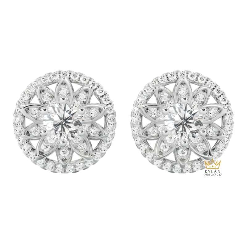 Ở giữa mặt bông tai là một viên kim cương tròn được đặt trong ổ đá kim loại. Các chấu kim loại được bố trí đều quanh viên đá để giữ vị trí của kim cương trong khung. Phần ổ đá được nâng nhẹ so với bề mặt kim loại xung quanh, giúp viên kim cương nằm rõ tại trung tâm của mặt bông tai và tách biệt với các chi tiết trang trí phía ngoài.