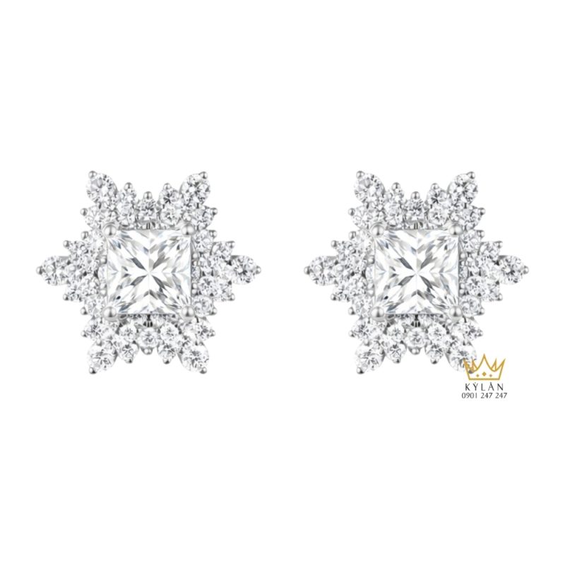 Tâm điểm của thiết kế là viên kim cương dáng vuông được đặt ở trung tâm bông tai. Kiểu cắt vuông mang lại cảm giác rõ nét, gọn gàng và tạo bố cục cân xứng cho tổng thể sản phẩm. Các giác cắt được xử lý sắc nét, giúp viên kim cương phản chiếu ánh sáng tốt khi nhìn từ nhiều hướng khác nhau. Viên đá được đặt ở độ cao vừa phải, không gây cộm tai và giữ được sự liền mạch với phần khung bao quanh.