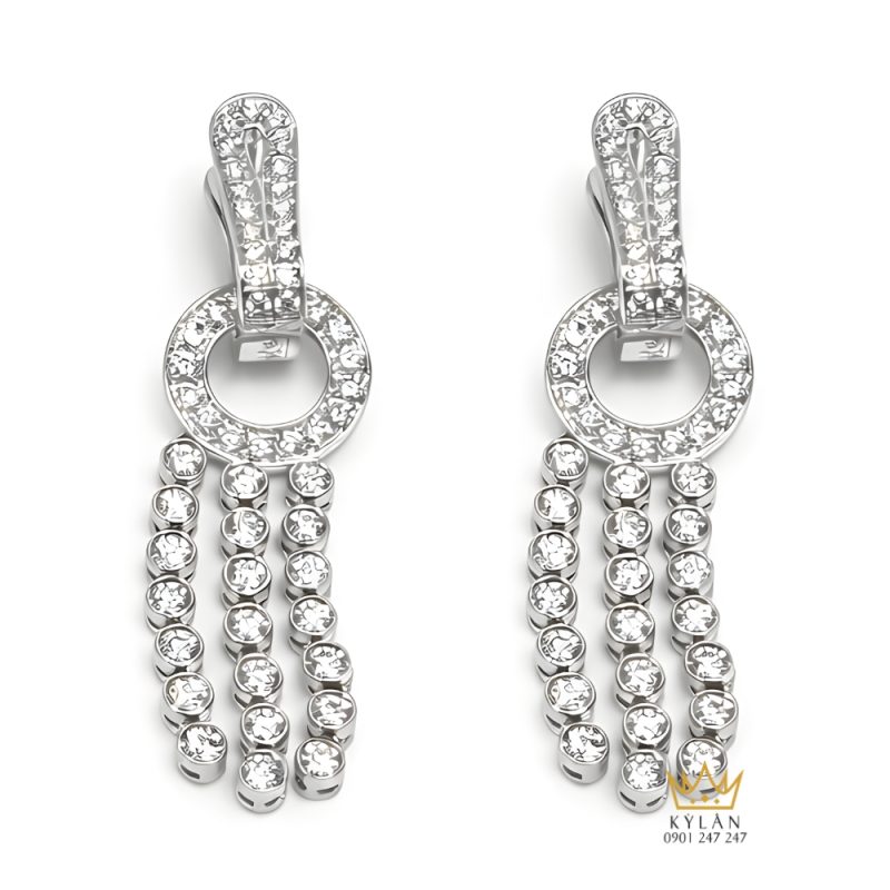 Toàn bộ phần móc tai, vòng tròn trung tâm và các dải rủ bên dưới đều được đính kim cương trắng với kích thước dao động khoảng 1.5mm – 2.5mm. Các viên kim cương được sắp xếp theo hàng song song, khoảng cách đều nhau, giúp ánh sáng phản chiếu liên tục khi đeo. Cách bố trí này tạo độ lấp lánh rõ ràng nhưng vẫn giữ được sự hài hòa tổng thể.