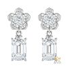 Điểm nhấn chính của bông tai nằm ở viên kim cương chủ dáng emerald hình chữ nhật được thả nhẹ bên dưới cụm kim cương tròn. Kiểu cắt emerald mang đến các mặt cắt rõ ràng, tạo hiệu ứng ánh sáng sắc nét nhưng không quá chói. Thiết kế thả rơi giúp viên chủ nổi bật hơn, đồng thời giữ được sự liền mạch cho tổng thể.