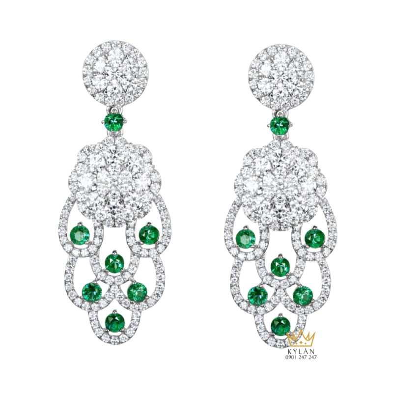 Các viên kim cương và ngọc lục bảo được cố định bằng chấu kim loại nhỏ tại từng vị trí. Các tầng đá được liên kết với nhau thông qua các khớp nối kim loại, tạo độ chuyển động nhẹ theo chiều dọc. Phần mặt sau sử dụng chốt vặn, cấu trúc chắc chắn, giúp giữ bông tai ổn định trên tai khi đeo.