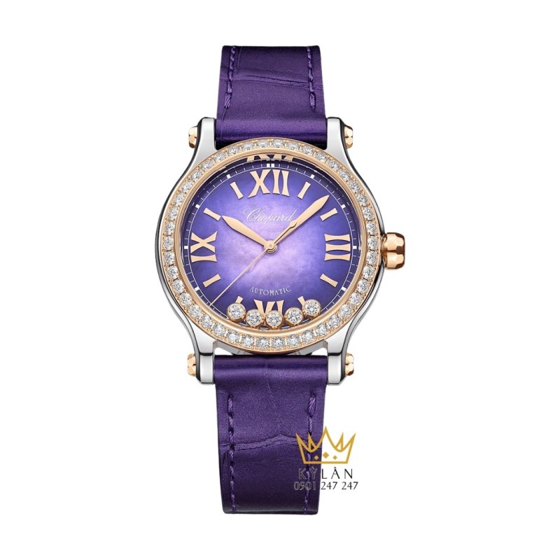 Mặt số xà cừ tím kết hợp bezel kim cương và Happy Diamonds chuyển động.