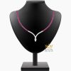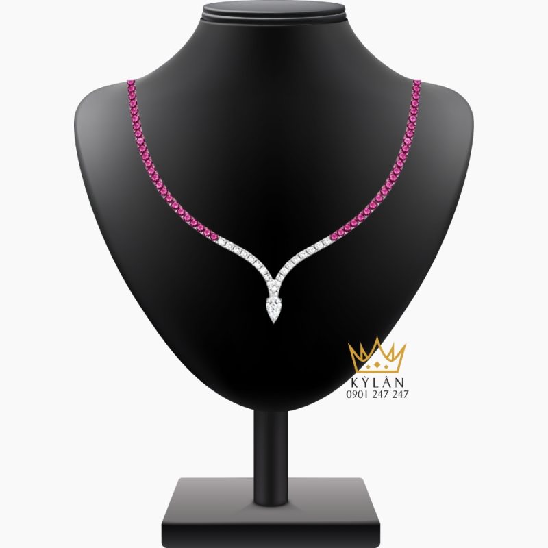 Dọc theo thân dây là sự kết hợp xen kẽ giữa kim cương trắng và đá quý hồng. Các viên đá được sắp xếp đều tay, phân bổ hợp lý theo chiều dài dây, tạo nên hiệu ứng chuyển màu nhẹ nhàng, không gây cảm giác rối mắt. Khi ánh sáng chiếu vào, bề mặt đá phản chiếu liên tục, giúp dây chuyền trở nên nổi bật hơn trong từng chuyển động nhỏ.