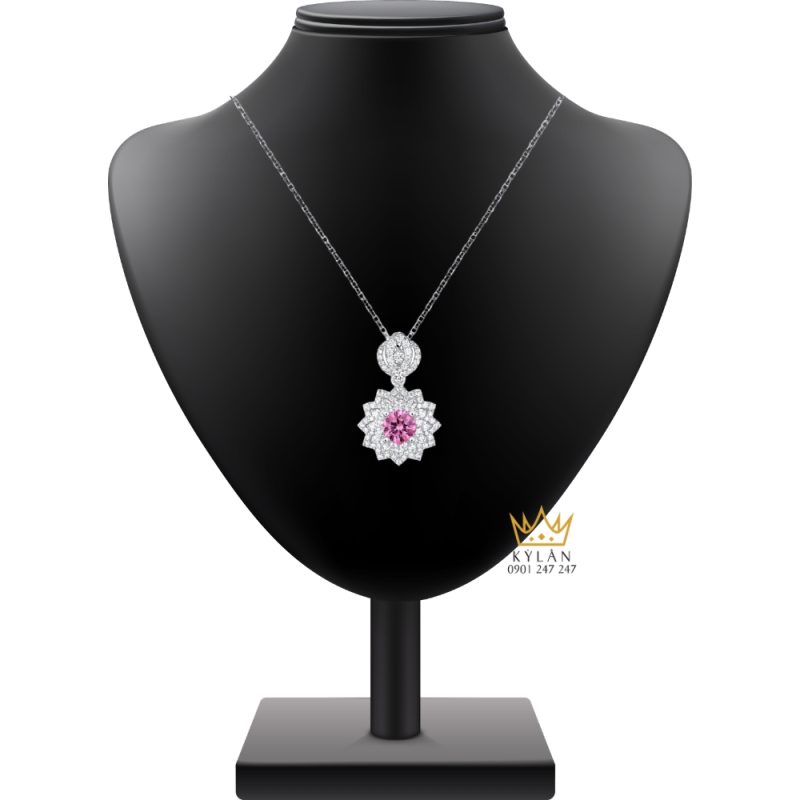 Mặt dây chuyền vàng trắng AU750 đính kim cương và sapphire hồng được thiết kế theo phong cách hoa cách điệu với cấu trúc tròn mềm mại. Tổng thể gồm nhiều tầng đá xếp lớp, tạo nên bố cục cân đối khi đeo trên cổ. Các chi tiết được sắp xếp theo trục đối xứng rõ ràng, giúp mặt dây giữ được sự hài hòa giữa phần trung tâm và các lớp bao quanh, đồng thời tạo hiệu ứng thị giác nổi bật từ nhiều góc nhìn.