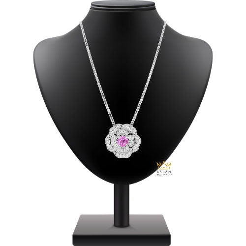 Mặt dây được tạo hình hoa nhiều lớp với bố cục tập trung vào viên sapphire tím trung tâm. Các lớp kim cương bao quanh được sắp xếp theo dạng đồng tâm, giữ khoảng cách ổn định và không lệch trục. Đường viền và các lớp chi tiết được xử lý mượt, các điểm nối kín, giúp tổng thể liền mạch khi quan sát trực diện. Hình khối phân tách rõ giữa trung tâm và các tầng cánh hoa.
