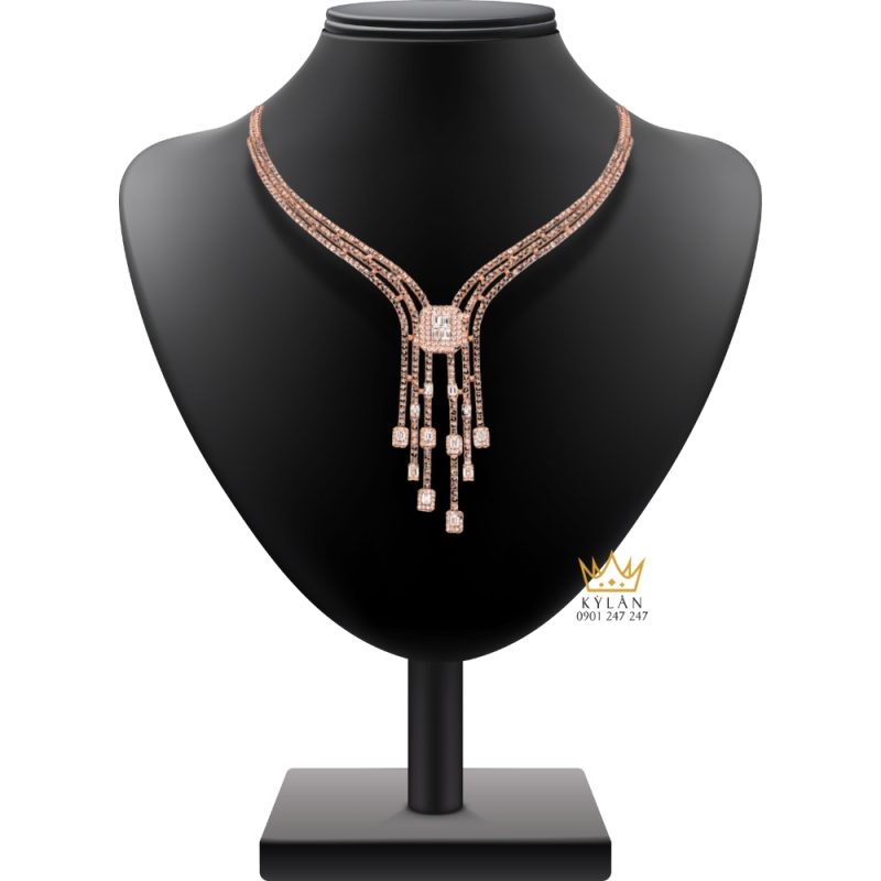 Dây chuyền vàng hồng Au750 đính kim cương là mẫu trang sức có thiết kế cầu kỳ, chú trọng bố cục nhiều lớp và sự liên kết giữa các chi tiết. Sản phẩm nổi bật với cấu trúc dây nhiều sợi song song kết hợp mặt dây hình học trung tâm và các dải tua rủ, tạo nên tổng thể hài hòa và rõ ràng về hình khối.