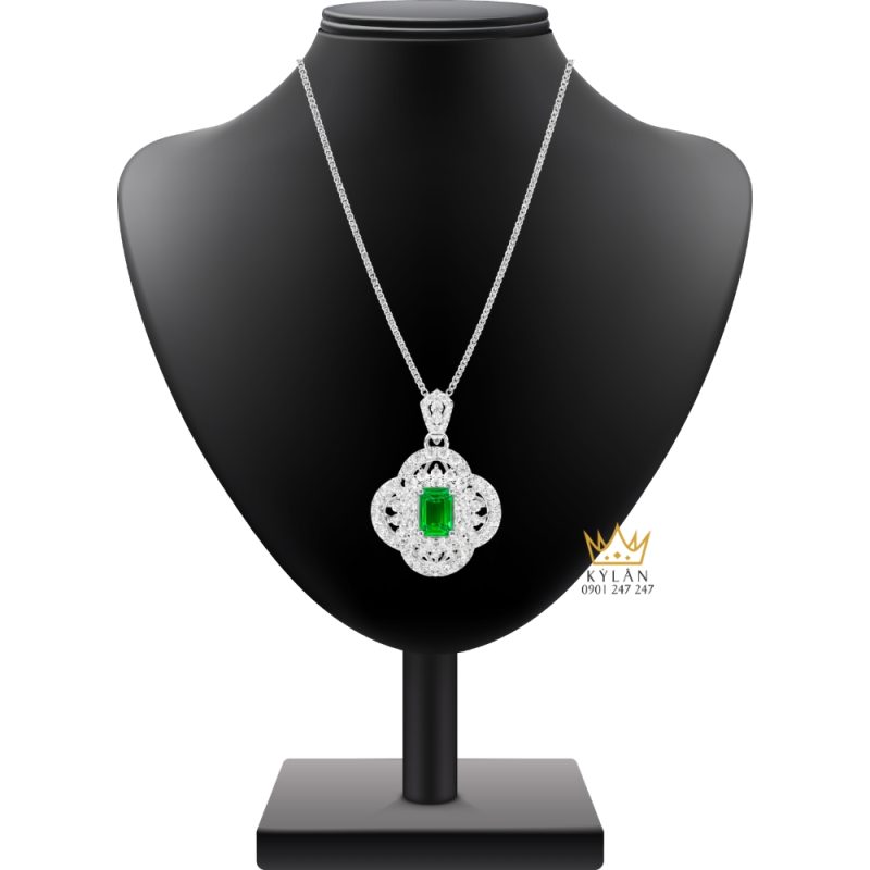 Mặt dây được tạo hình hoa bốn cánh với bố cục đối xứng theo trục dọc và ngang, giúp tổng thể cân bằng khi nhìn trực diện. Viên đá lục bảo dáng chữ nhật nằm đúng vị trí trung tâm, các chi tiết xung quanh bám theo biên dạng cánh hoa. Khoảng cách giữa các lớp được giữ ổn định, không lệch hướng. Các đường viền xử lý mượt, điểm nối kín, tạo hình khối rõ ràng.