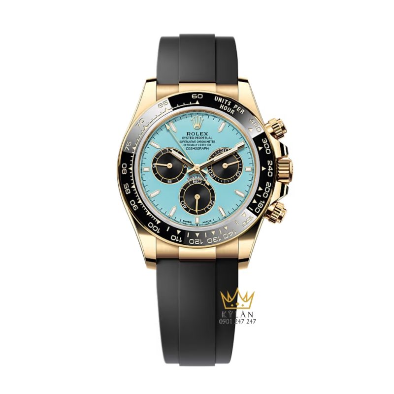 Tâm điểm của Daytona vàng vàng này nằm ở mặt số xanh ngọc nổi bật, gam màu hiếm gặp trong thế giới Daytona, mang lại cảm giác trẻ trung, táo bạo và cực kỳ thời trang. Các mặt số phụ chronograph màu đen tạo chiều sâu thị giác rõ rệt, đồng thời giúp bố cục mặt số cân đối và dễ quan sát.