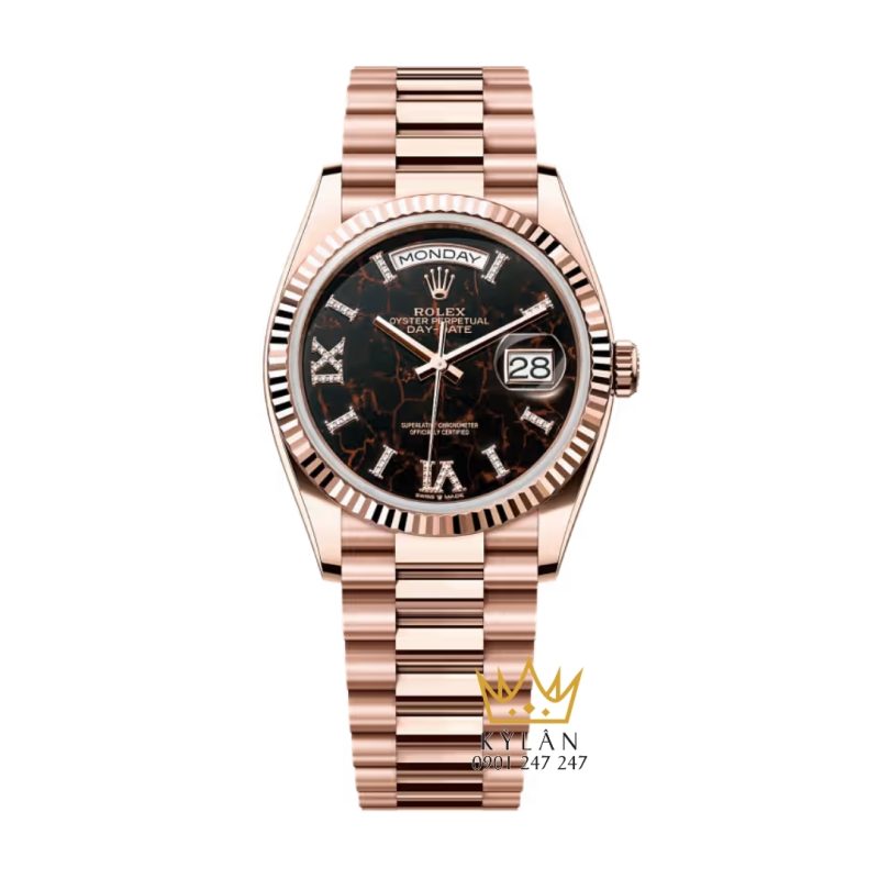 Điểm đặc biệt của phiên bản này nằm ở mặt số thạch anh Eisenkiesel độc đáo, một loại đá quý hiếm có màu nâu sẫm với những đường vân tinh tế. Mặt số được nạm 32 viên kim cương trên các vạch chỉ giờ, cùng với chữ số La Mã “VI” và “IX” được nạm 24 viên kim cương, tạo nên một sự tương phản tinh tế và sang trọng. Vành bezel khía đặc trưng của Rolex càng làm tăng thêm vẻ đẹp cổ điển và quyền quý.
