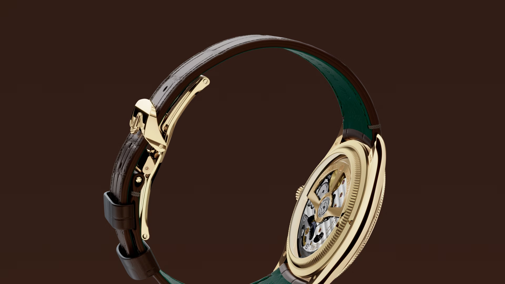 Bằng cách vận hành xưởng đúc độc quyền của riêng mình, Rolex có khả năng vô song trong việc đúc các hợp kim vàng 18 ct chất lượng cao nhất. Theo tỷ lệ bạc, đồng, bạch kim hoặc palađi được thêm vào, các loại vàng 18 ct khác nhau thu được: vàng, hồng hoặc trắng. Màu nâu mờ hoặc đen mờ, dây đeo trang nhã này được thiết kế riêng cho chiếc đồng hồ mới, với lớp lót màu xanh lá cây và đường khâu đồng điệu.