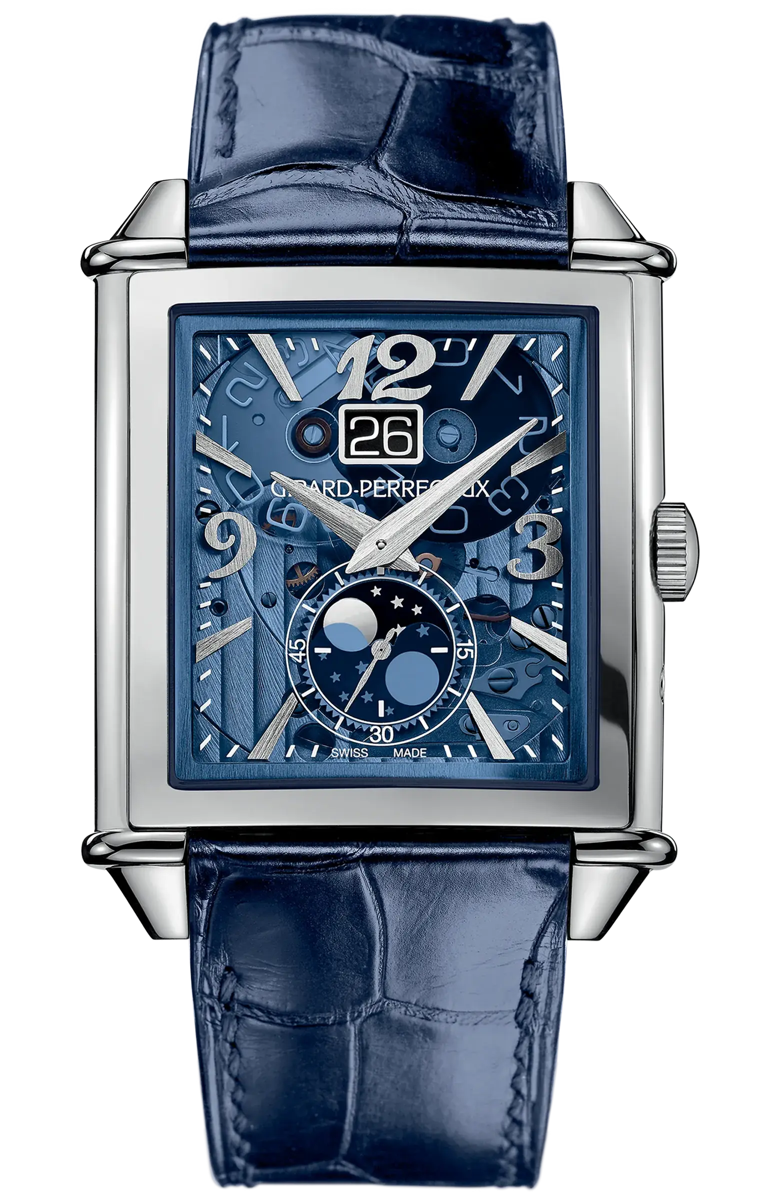 Điểm đặc trưng khiến giới sưu tầm say đắm dòng Vintage 1945 chính là cấu trúc vỏ hình chữ nhật. Bộ vỏ có kích thước 36,10 x 35,25 mm khá độc đáo và đơn giản. Tuy được gắn mác “XXL”, nhưng nhờ thiết kế uốn cong theo chiều dọc của cổ tay, chiếc đồng hồ mang lại cảm giác lên tay vô cùng vừa vặn và tinh tế. Với một thiết kế đối xứng, cửa sổ “Ngày” khá lớn được đặt tại vị trí 12 giờ tạo nên sự đối trọng hoàn hảo cùng với chỉ báo chu kỳ mặt trăng (Moon Phases) ở góc 6 giờ. Với thiết kế này, không chỉ gợi nhớ đến di sản thẩm mỹ đầu thế kỷ 20. Mà còn khẳng định tư duy thiết kế hiện đại, không bao giờ lỗi mốt của Girard-Perregaux.