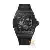 Điểm nhấn lớn nhất của mẫu đồng hồ nằm ở mặt số skeleton với các chi tiết mô phỏng hiệu ứng va chạm “impact”, tạo nên tổng thể mạnh mẽ và đầy nghệ thuật. Thiết kế mở cho phép người đeo quan sát rõ cấu trúc cơ khí bên trong nhưng vẫn giữ trọn tinh thần All Black đặc trưng.