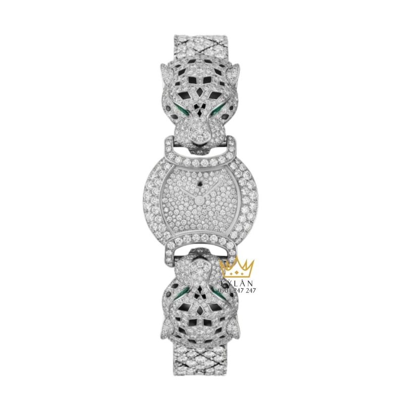 Điểm nhấn mang tính biểu tượng chính là đầu báo Panthère được chế tác hoàn toàn bằng vàng trắng, đính hàng trăm viên kim cương tự nhiên. Đôi mắt báo sử dụng ngọc lục bảo, tạo chiều sâu và thần thái sống động, trong khi các chi tiết đốm được xử lý bằng sơn mài đen thủ công, mang lại độ tương phản sắc nét và giàu tính nghệ thuật. Từng chi tiết nhỏ đều phản ánh trình độ kim hoàn cao cấp và sự tỉ mỉ đặc trưng của Maison Cartier.