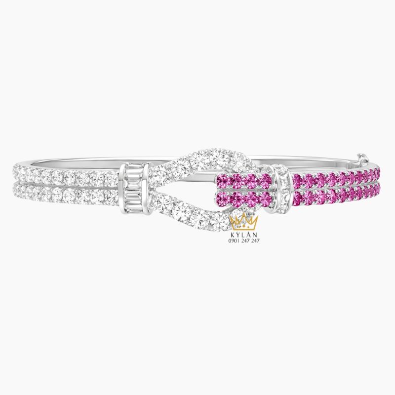 Cách đính đá theo bố cục song song giúp ánh sáng phản xạ đều dọc theo thân lắc. Kim cương và đá màu hồng được bố trí với mật độ hợp lý, hạn chế khoảng trống, tạo hiệu ứng ánh sáng liên tục khi cổ tay chuyển động. Bề mặt lắc tay giữ được sự gọn gàng, không gây cảm giác dày đặc khi nhìn gần.