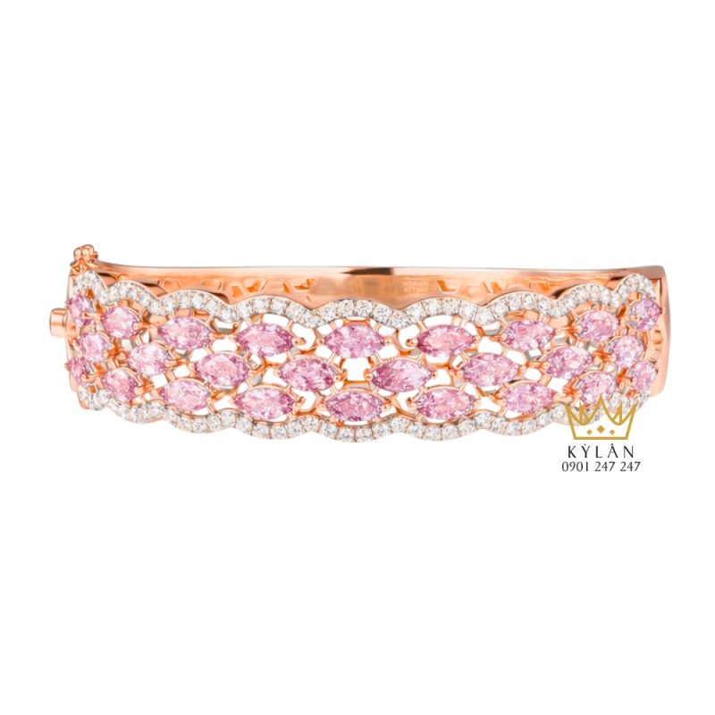 Lắc tay vàng hồng Au750 đính kim cương và đá quý hồng là mẫu trang sức có thiết kế chỉn chu, chú trọng vào bố cục, đường nét và sự liên kết giữa các chi tiết. Sản phẩm mang phong cách hiện đại, mềm mại, phù hợp với người yêu thích trang sức có cấu trúc rõ ràng nhưng vẫn giữ được cảm giác nhẹ nhàng khi đeo.