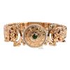 Ngọc lục bảo tròn trung tâm trên lắc tay vàng hồng Au750, bao quanh bởi họa tiết khắc vòng tròn.
