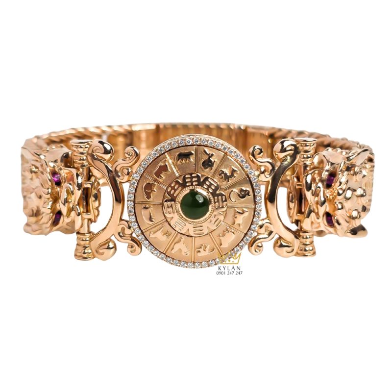 Lắc Tay Vàng Hồng Au750 Mặt Tròn Khắc 12 Con Giáp Đính Kim Cương