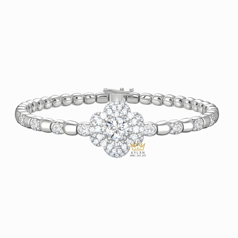 Điểm nhấn chính của mẫu lắc tay nằm ở cụm kim cương trung tâm được sắp xếp theo hình bông hoa. Viên kim cương chủ đặt ở giữa được bao quanh bởi nhiều viên kim cương nhỏ đính sát nhau. Cấu trúc này tạo chiều sâu cho chi tiết trung tâm, giúp khu vực này dễ nhận diện khi quan sát trực diện và tạo sự liên kết hài hòa với các mắt xích hai bên.