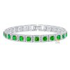 Lắc tay vàng trắng Au750 mắt vuông lặp lại, đá lục bảo trung tâm mỗi mắt, viền kim cương ôm theo khung vuông, bố cục thẳng hàng rõ trục, bề mặt phẳng và liền mạch.