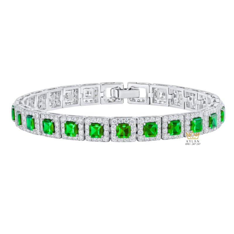 Lắc tay được tạo thành từ các mắt vuông lặp lại liên tục theo chiều dài, bố cục thẳng hàng và rõ trục. Mỗi mắt chứa một viên đá lục bảo đặt tại trung tâm, các chi tiết bao quanh bám theo cùng biên dạng. Khoảng cách giữa các mắt được giữ ổn định, không lệch hướng. Bề mặt xử lý phẳng, các điểm nối kín, tạo tổng thể liền mạch khi quan sát.