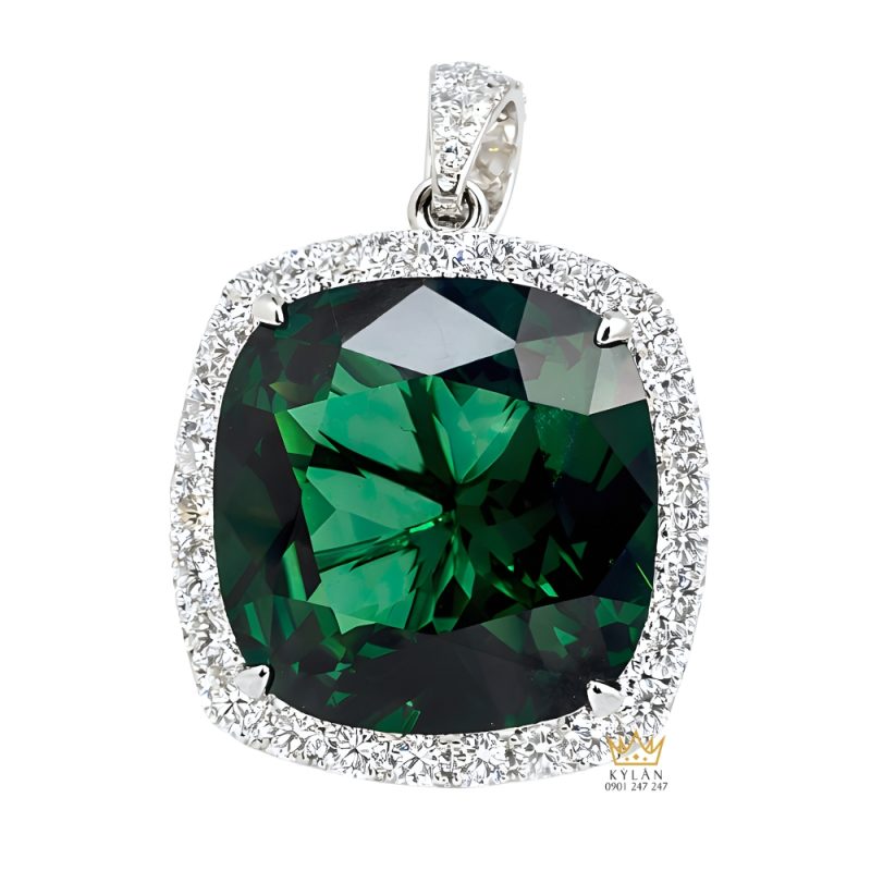Mặt dây chuyền nổi bật với viên ngọc lục bảo chủ có kích thước 18 x 20 mm, mang sắc xanh lục tươi mát và sâu lắng. Viên đá này là điểm nhấn chính của thiết kế, với sự tỏa sáng tự nhiên và sắc thái độc đáo. Kiểu cắt của ngọc lục bảo giúp viên đá tỏa sáng dưới mọi góc độ, tạo sự thu hút và mang lại vẻ đẹp thanh thoát cho chiếc mặt dây chuyền. Sự lựa chọn ngọc lục bảo làm trung tâm cho mặt dây chuyền này tạo nên một cảm giác nhẹ nhàng nhưng đầy cuốn hút.