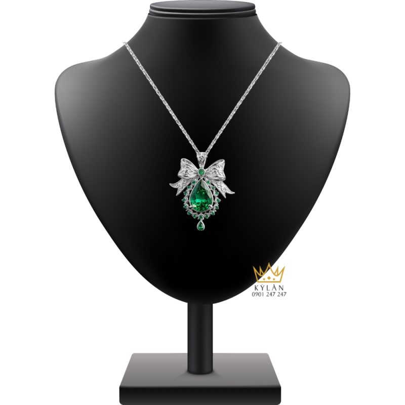 Trung tâm mặt dây chuyền là viên đá quý xanh dáng giọt nước (pear cut), sở hữu sắc xanh sâu, trong và đầy cuốn hút. Kiểu cắt giọt nước giúp viên đá phản xạ ánh sáng mềm mại, tạo cảm giác thanh thoát và kéo dài dáng mặt dây. Viên đá được cắt mài tỉ mỉ nhằm tối ưu độ lấp lánh, trở thành điểm nhấn nổi bật ngay từ ánh nhìn đầu tiên.