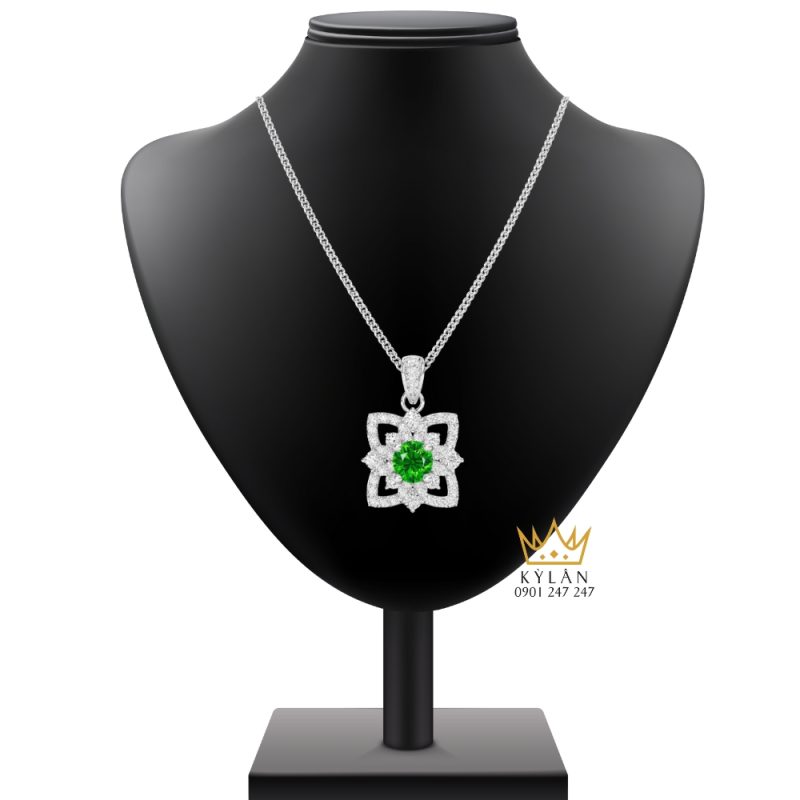 Tâm điểm của mặt dây chuyền là viên đá quý xanh dáng tròn được đặt ở vị trí trung tâm. Viên đá có sắc xanh tươi sáng, chiều sâu rõ ràng, tạo cảm giác dễ chịu khi quan sát trực diện. Cách đặt đá trung tâm giúp mặt dây chuyền giữ được bố cục ổn định, đồng thời làm nổi bật màu sắc của viên đá mà không bị phân tán bởi các chi tiết xung quanh.