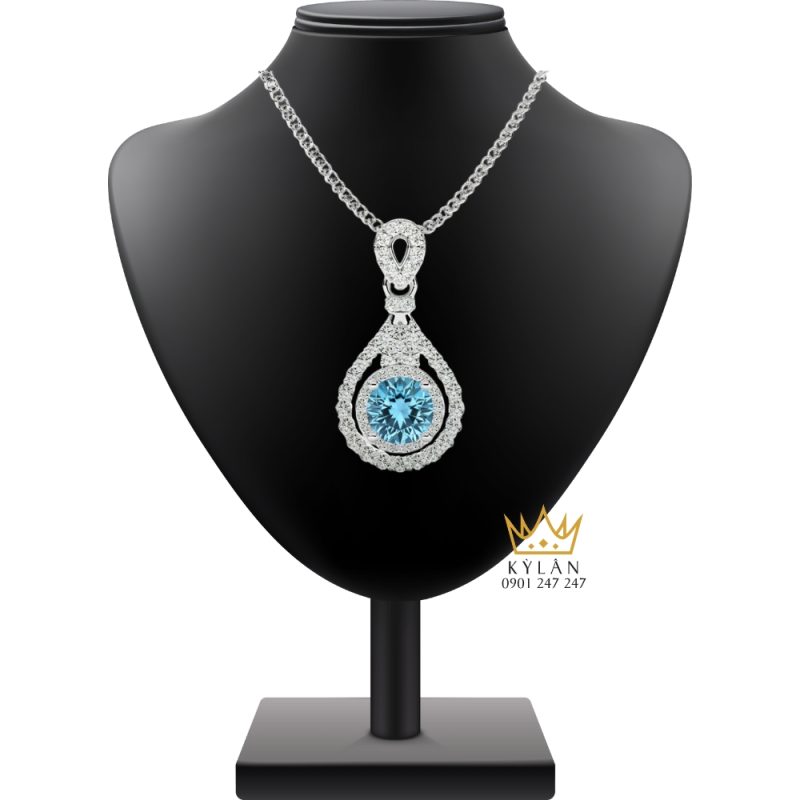 Mặt dây chuyền vàng trắng Au750 đính kim cương và đá Topaz là một sản phẩm sang trọng và đầy quyến rũ, mang đến vẻ đẹp tinh tế cho người sở hữu. Trung tâm của mặt dây là viên đá Topaz màu xanh dương, một màu sắc nổi bật và đầy cuốn hút. Viên đá Topaz này được bao quanh bởi những viên kim cương trắng lấp lánh, tạo nên hiệu ứng ánh sáng tuyệt vời, làm nổi bật vẻ đẹp của chiếc dây chuyền.