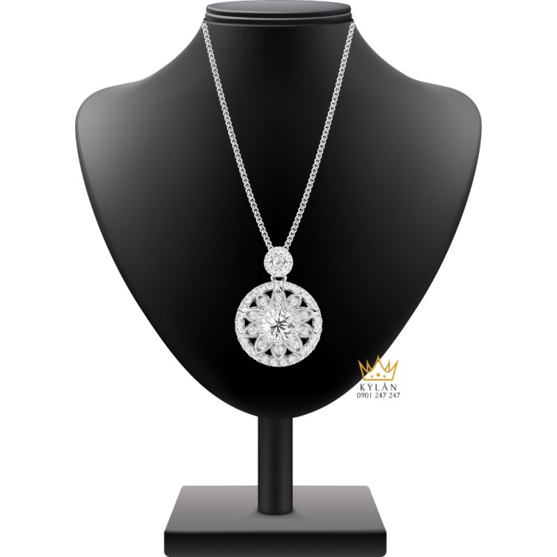 Phần mặt chính của mặt dây chuyền có dạng hình tròn với bố cục hoa ở trung tâm. Một viên kim cương tròn được đặt tại vị trí giữa và cố định bằng các chấu kim loại. Bao quanh viên đá trung tâm là các cánh kim loại dạng thuôn dài được sắp xếp đối xứng quanh tâm. Các cánh này tạo thành hình hoa nhiều lớp nằm trong khuôn tròn của mặt dây chuyền.