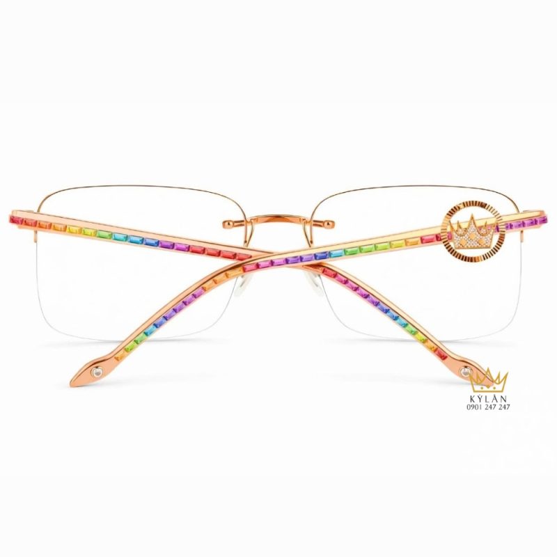 Mẫu mắt kính vàng hồng Au750 đính kim cương và đá quý Rainbow được thiết kế theo định hướng chú trọng vào đường nét, tỷ lệ và cách xử lý chi tiết. Tổng thể kính sử dụng cấu trúc gọng không viền, tạo cảm giác nhẹ và thoáng khi đeo. Các chi tiết kim loại được hoàn thiện gọn gàng, kết hợp cùng đá quý cắt baguette và kim cương đính điểm, mang lại bố cục rõ ràng và đồng bộ.