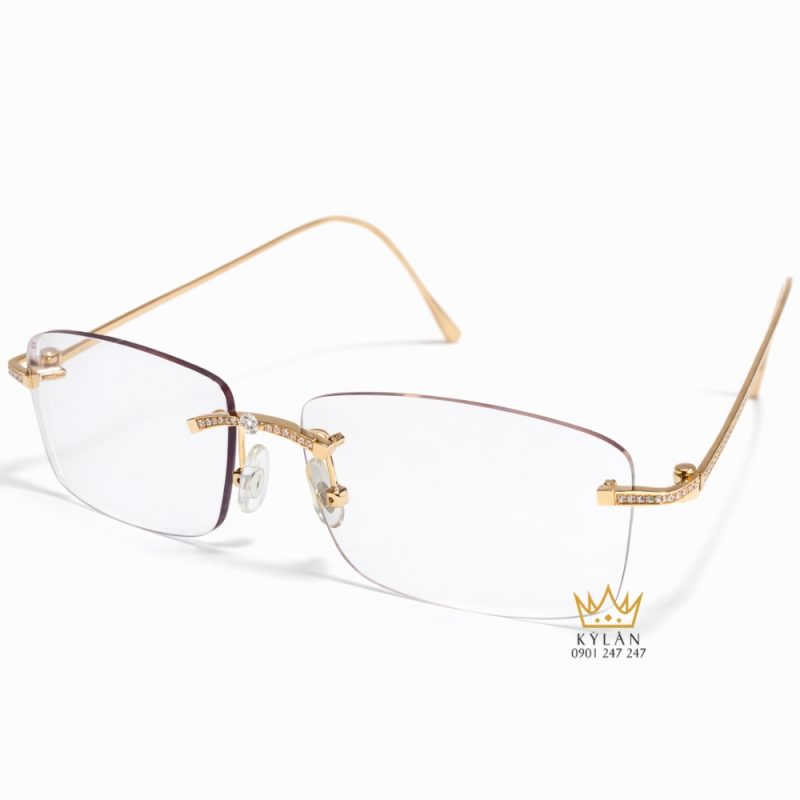 Gọng kính được thiết kế theo cấu trúc không viền, phần tròng được cố định trực tiếp vào cầu kính và càng kính. Cách xử lý này giúp tổng thể kính trông gọn gàng, giảm cảm giác nặng ở phần mặt trước. Các thanh kim loại vàng hồng Au750 được làm mảnh, đường nét dứt khoát, hạn chế chi tiết dư thừa, tạo form kính thanh thoát khi nhìn trực diện cũng như từ góc nghiêng.