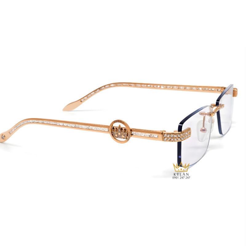 Mắt kính vàng hồng Au750 không viền, đính logo vương miện và kim cương baguette, thiết kế gọn gàng, đường nét thanh thoát.