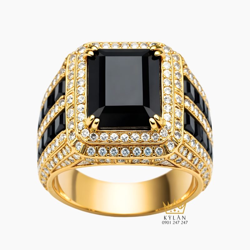 Phần thân nhẫn được thiết kế theo cấu trúc nhiều tầng, kết hợp giữa kim cương tròn và các viên đá đen cắt hình kim tự tháp. Các chi tiết được sắp xếp đối xứng hai bên, tạo sự cân đối khi nhìn từ nhiều góc độ. Bề mặt vàng được hoàn thiện bóng mịn, mặt trong thân nhẫn và các chi tiết chạm khắc được xử lý gọn gàng, giúp nhẫn ôm tay và ổn định khi đeo trong thời gian dài.