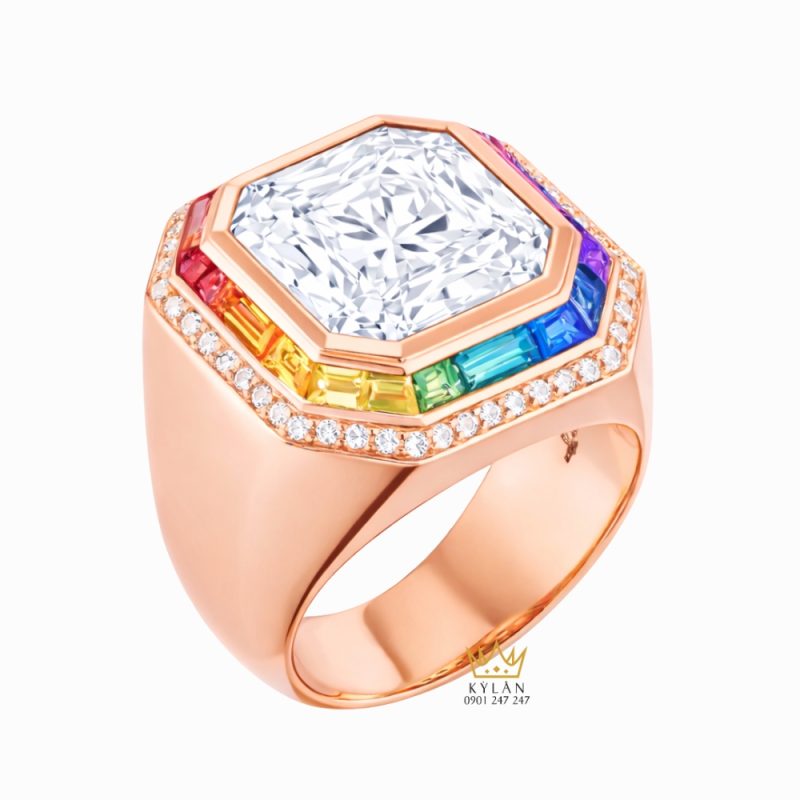 Nhẫn nam vàng hồng Au750 đính kim cương và đá quý Rainbow được thiết kế với định hướng tập trung vào hình khối, tỷ lệ và mức độ hoàn thiện chi tiết. Tổng thể chiếc nhẫn có dáng bản rõ ràng, các mặt được xử lý gọn gàng, tạo cảm giác liền mạch khi quan sát. Sự kết hợp giữa kim cương trắng và đá quý Rainbow cắt baguette mang đến bố cục màu sắc cân đối, hiện đại và có chiều sâu thị giác.