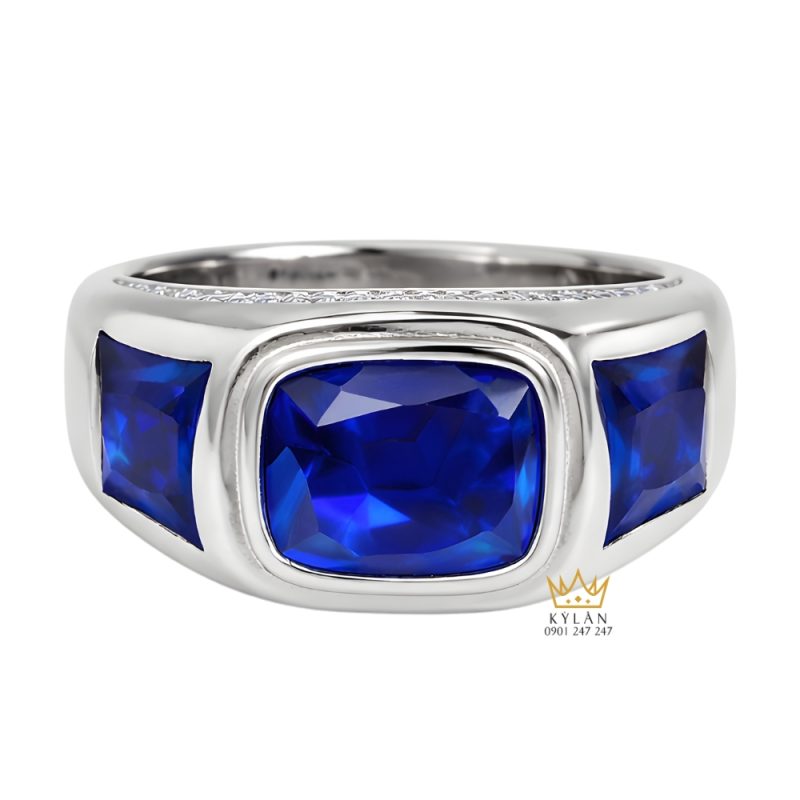 Mẫu nhẫn nam vàng trắng Au750 đính kim cương và sapphire xanh được thiết kế với bố cục tập trung vào viên sapphire xanh dáng vuông bo góc đặt tại trung tâm. Viên đá được cố định chắc chắn trong khung kim loại, giúp giữ ổn định hình dáng khi quan sát trực diện. Kiểu cắt vuông bo góc tạo cảm giác rõ ràng về hình khối, đồng thời giúp mặt nhẫn dễ nhận diện và giữ được sự cân đối tổng thể khi đeo trên tay.