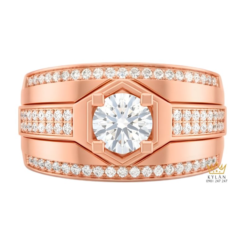Mẫu nhẫn nam vàng hồng Au750 đính kim cương được thiết kế với bố cục tập trung vào viên kim cương tròn lớn đặt tại vị trí trung tâm. Viên đá được nâng cao vừa phải, giúp ánh sáng tiếp xúc tốt với bề mặt khi quan sát từ nhiều góc độ. Cách đặt kim cương trung tâm tạo điểm nhìn rõ ràng, giúp mặt nhẫn dễ nhận diện và giữ được sự cân đối tổng thể khi đeo trên tay.