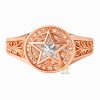 Tại trung tâm mặt nhẫn là viên kim cương cắt hình ngôi sao, được đặt nổi bật trên trục chính của thiết kế. Viên chủ được cố định chắc chắn, bố trí cân xứng, giúp mặt nhẫn có điểm tập trung rõ ràng. Kiểu cắt hình ngôi sao tạo hiệu ứng bề mặt khác biệt khi ánh sáng phản chiếu, làm nổi bật khu vực trung tâm mà không phá vỡ bố cục chung.