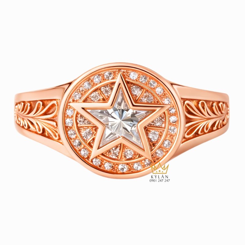 Nhẫn nam vàng hồng Au750 đính kim cương được thiết kế với trọng tâm đặt vào hình khối, bố cục mặt nhẫn và mức độ hoàn thiện chi tiết. Tổng thể chiếc nhẫn sở hữu dáng mặt tròn rõ ràng, các đường nét được xử lý gọn gàng, tạo cảm giác liền mạch khi quan sát. Sự kết hợp giữa kim cương cắt hình ngôi sao và kim cương tấm xung quanh giúp mặt nhẫn có chiều sâu thị giác và điểm nhấn khác biệt.