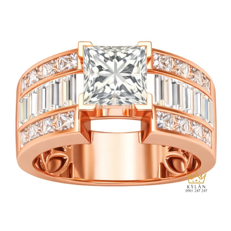 Nhẫn nam vàng hồng Au750 đính kim cương là mẫu trang sức được thiết kế với bố cục rõ ràng, chú trọng vào hình khối và độ hoàn thiện bề mặt. Sản phẩm gây ấn tượng nhờ sự kết hợp giữa viên kim cương trung tâm cắt vuông và hệ kim cương bố trí dọc thân nhẫn, tạo nên tổng thể chắc chắn và cân đối khi đeo.