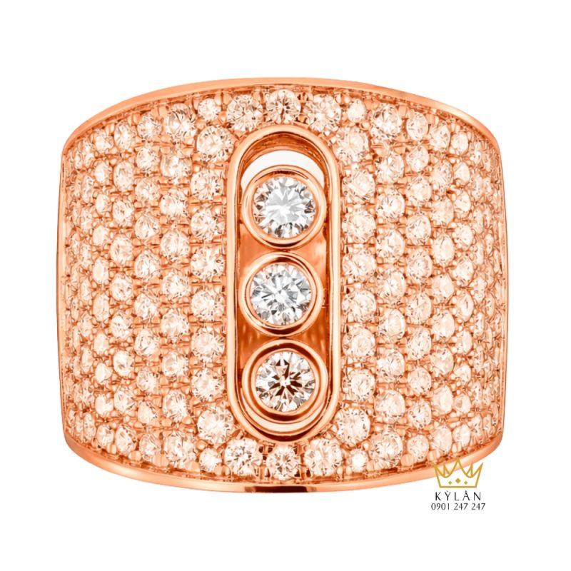 Toàn bộ khu vực mặt nhẫn được đính kim cương tròn nhỏ sắp xếp dày theo hàng đều nhau. Các viên đá được cố định bằng chấu nhỏ gọn, đặt sát nhau tạo bề mặt liên tục. Kiểu pavé giúp các viên đá liên kết thành mảng sáng đồng nhất, đồng thời giữ khoảng cách đều giữa từng viên.