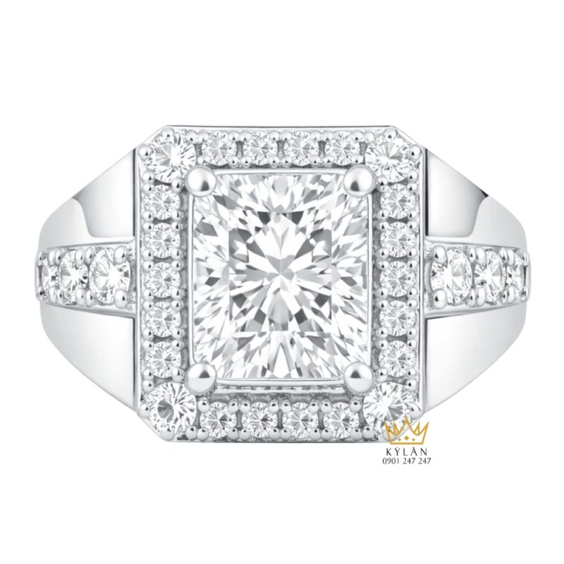 Mặt nhẫn được tạo hình vuông bản lớn với các cạnh thẳng và góc rõ, bố cục sắp xếp theo trục đối xứng. Viên kim cương trung tâm nằm đúng vị trí giữa, các lớp đá xung quanh được phân bổ đều theo từng cấp. Tỷ lệ giữa phần mặt và thân được cân chỉnh hợp lý, giúp tổng thể không bị lệch khi nhìn trực diện. Các bề mặt được xử lý phẳng, các điểm nối kín, tạo hình khối liền mạch.