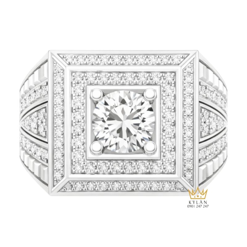 Tại vị trí trung tâm là viên kim cương tròn được nâng cao bằng hệ chấu cố định gọn gàng. Bao quanh là nhiều lớp kim cương tấm xếp theo khung vuông đồng tâm, tạo chiều sâu rõ ràng cho mặt nhẫn. Cách sắp xếp nhiều tầng giúp ánh sáng phản xạ liên tục trên bề mặt, đồng thời giữ bố cục rõ ràng, không gây cảm giác rối chi tiết.