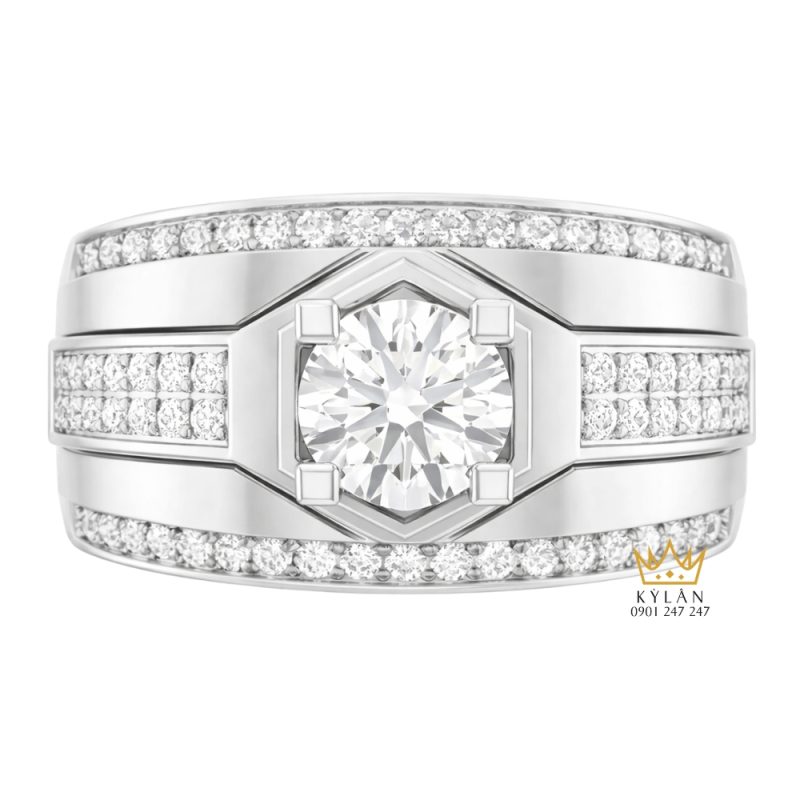 Mẫu nhẫn nam vàng trắng AU750 đính kim cương được định hình theo phong cách hình học rõ nét với thân bản rộng và cấu trúc dày dặn. Kiểu dáng vuông vức kết hợp các đường cắt thẳng tạo diện mạo gọn gàng ngay từ góc nhìn chính diện. Bố cục tổng thể tập trung vào mặt nhẫn trung tâm, nơi các chi tiết được sắp xếp cân xứng, giúp sản phẩm giữ được sự rõ ràng trong từng đường nét và đảm bảo tính ổn định khi đeo hằng ngày.