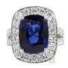Vòng kim cương trắng kiểu halo bao quanh sapphire xanh trung tâm, sắp xếp đều tạo hiệu ứng ánh sáng hài hòa.