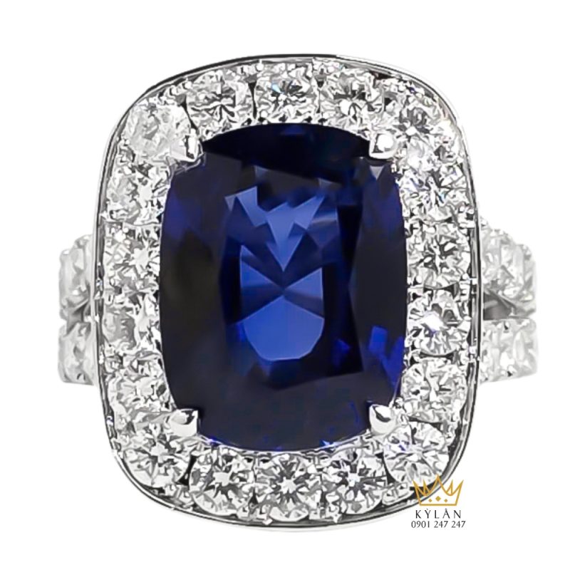 Bao quanh viên sapphire là vòng kim cương trắng được đính sát theo bố cục halo tròn đều. Các viên kim cương có kích thước đồng nhất, sắp xếp liên tục, tạo hiệu ứng phản xạ ánh sáng ổn định. Thiết kế halo giúp làm nổi bật viên sapphire trung tâm, đồng thời tăng chiều sâu cho mặt nhẫn mà vẫn giữ được sự gọn gàng.