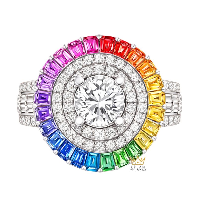 Đá baguette xếp thành vòng tròn chuyển sắc rainbow, mỗi viên giữ bằng hai chấu tạo dải màu liên tục quanh trung tâm.