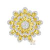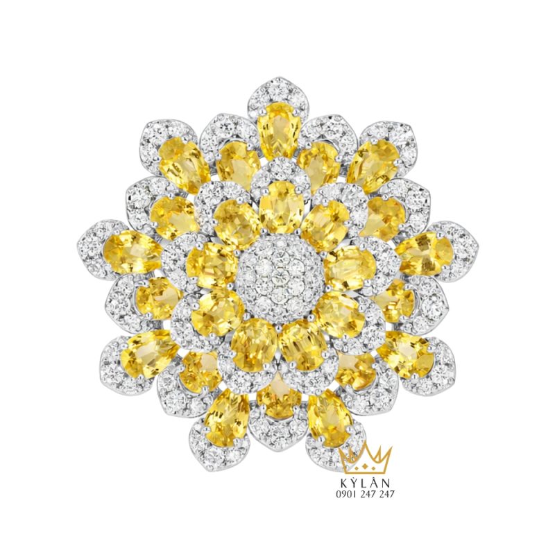 Bao quanh cụm kim cương là những viên đá quý màu vàng dáng giọt nước, được xếp đều thành nhiều lớp cánh hoa. Dáng giọt nước mềm mại giúp các lớp đá ôm trọn phần trung tâm, tạo cảm giác chuyển tiếp tự nhiên giữa các tầng. Sắc vàng của đá quý kết hợp hài hòa với kim cương trắng, mang lại sự tương phản nhẹ nhàng và dễ nhìn.